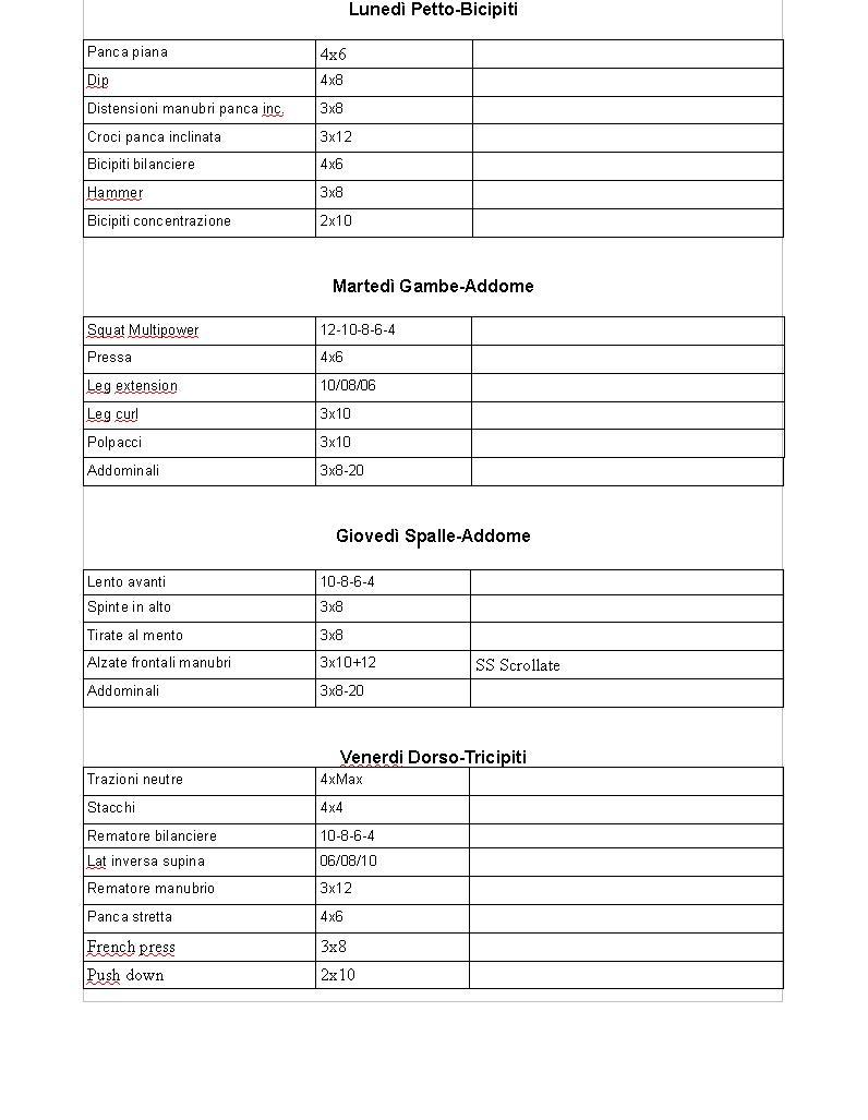 Lo squat fallo ASSOLUTAMENTE libero, pressa 4x8 e leg extension 10/12 rip, il lento avanti fallo a basse rep (da 6 a 8), sostituisci il press manubri con l'arnold press, la ss con le scrollate falla con le alzate laterali, togli l'addome dal wo delle spalle, lo stacco meglio come 1° ex, sostituisci il rem manubrio con il pulley, il resto è okCOACH ON LINE-CONSULENZE E PROGRAMMI PERSONALIZZATI: alexbodyweb@libero.it
