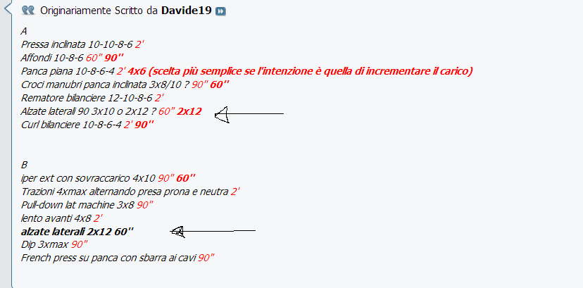 A Pressa inclinata 10-10-8-6 2' Affondi 10-8-6 60" 90'' Panca piana 10-8-6-4 2' 4x6 (scelta più semplice se l'intenzione è quella di incrementare il carico) Croci manubri panca inclinata 3x8/10 ? 90" 60'' Rematore bilanciere 12-10-8-6 2' Alzate laterali 90 3x10 o 2x12 ? 60" 2x12 Curl bilanciere 10-8-6-4 2' 90''