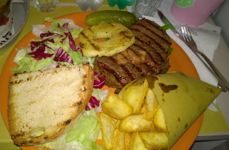 ) poi c'erano cartoccio di patate fritte stile rustico, insalta e fetta di ananas grigliato e centriolino....