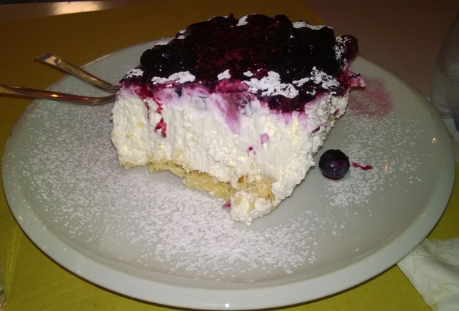 Il dolce si una botta: il nome di preciso nn lo ricordo mi pare goumbori ai mirtilli: (puladelphia+yogurt greco, su base di biscotti sekki, burro e nocciole e copertura di mirtilli neri.