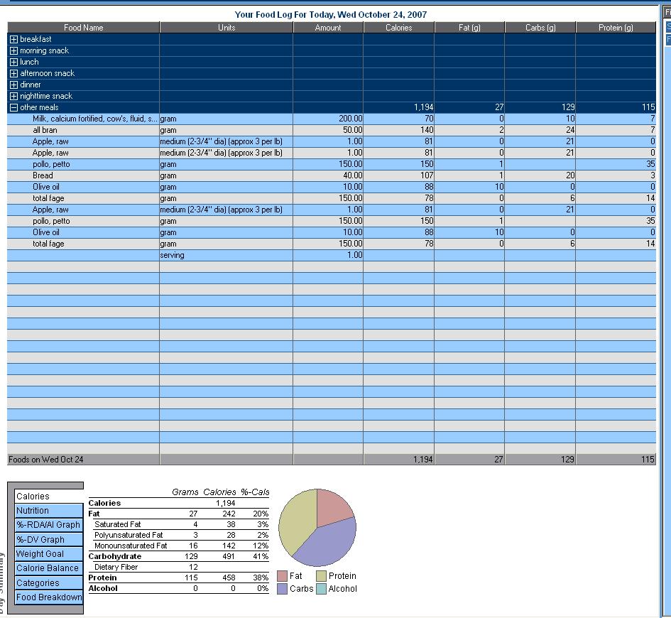 Colazione: 200ml latte PS,circa 50g cereali all bran fiocchi,una mela media